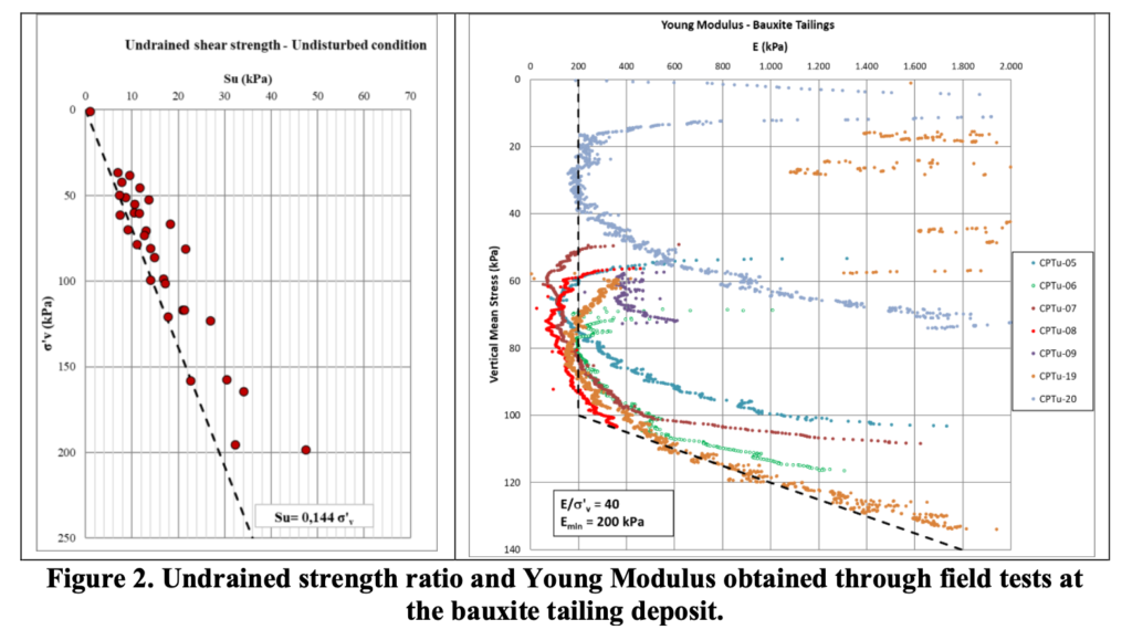 Due to the disposal method and tailings moisture, it presents a low strength with typical undrained behavior, as observed at the Vane Test performed inside the reservoir. Observing the minimum values obtained from the results of the tests in the undisturbed condition (Figure 2, left graph), undrained shear strength values (Su) varied from 7 kPa to 45 kPa, and the undrained shear ratio of Su/σ’v = 0.144.