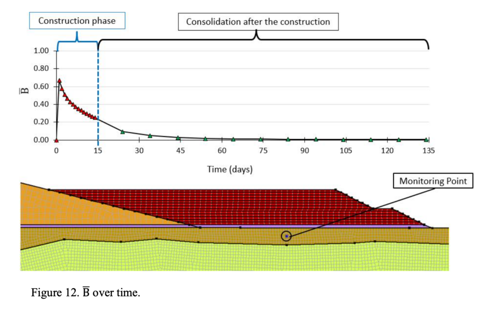 Figure 12 shows the variation of B overtime at a single point in the middle of the colluvium layer. The highest B found at the beginning of the buttress construction was 0.67 and it is decreasing over time, especially after the end of the construction. Approximately 60 days after the end of construction B is equal to 0 indicating the final dissipation of the generated pore pressure.
